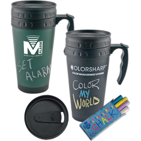 This also comes in a 16oz travel size mug. Sitting at a light and an idea pops to mind? Traveling with the kids and out of paper? Use this handy mug with multiple uses. Comes with a pack of chalk.