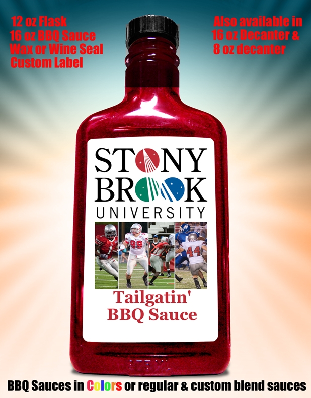 What a novel idea. You can now bottle BBQ sauce with your corporate color. Here is an example of bottling using the color RED, for Stony Brook. This is a great item for gift shops, tailgating, picnics and more. I always love a new and unique item. We can also offer you custom labels on spices, foods as well as many other items.
