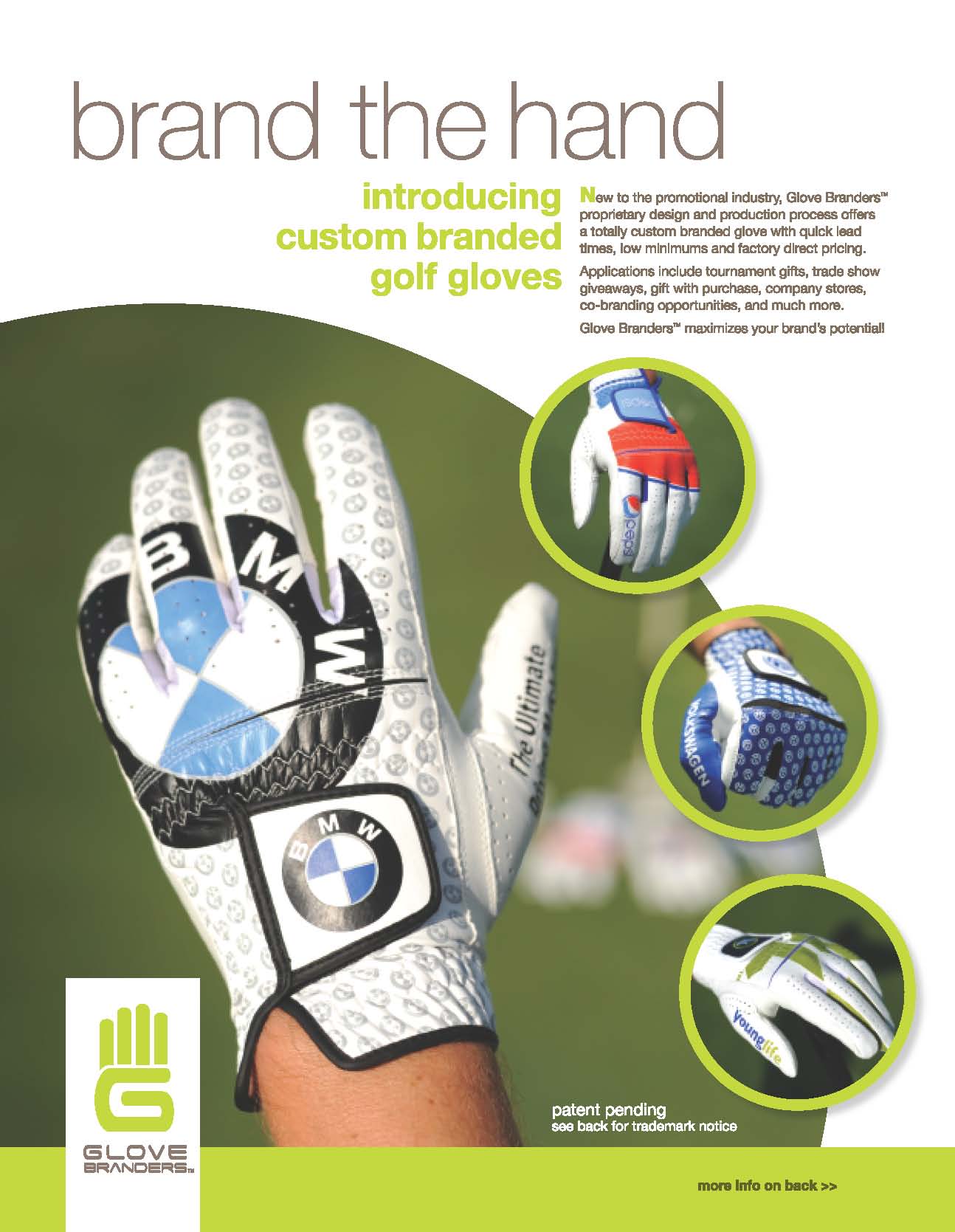 You are sponsoring a golf event. You want to make sure that your name is seen all day long and not forgotten. Think of seeing your name before, during and long after the day of the outing. How can you do this? We can make you custom premium golf gloves with your name and logo in any design and colors you want. Picture a step and repeat pattern all over the glove. Add a large copy of your logo.