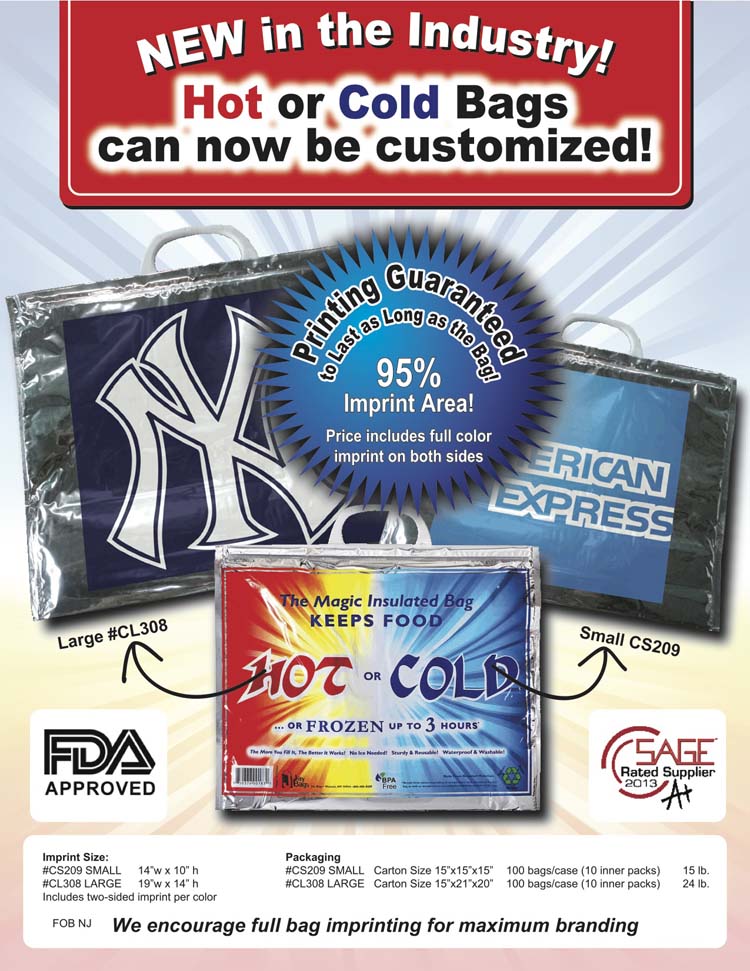 WOW! Great overall imprint area for full exposure. In the cold months keep your food warm for travel, delivery, whenever and wherever you need. In the summer months use these custom FDA approved bags with huge impact imprint area to keep your food cold for picnics, concerts, the beach and travel. For less than $2 you can have these bags with your custom logo and imprint printed in full color on both sides. Any season is the right season for these bags.