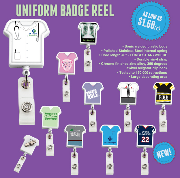 Uniform Badge Reels have always been and I believe will always be a very popular and necessary item. They hold identification to access to company buildings, hospitals, organizations and events. They come in all different shapes and colors and include different finishing options for you logo like direct print, labels and my favorite epoxy dome. Now you have a choice to get them with these uniform ideas and/or create your own brand.