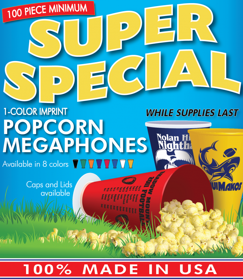 It is that time of year again when everyone is gearing up for the beginning of the new school year. Popcorn megaphones, unbelievable sale while supplies last! Great hand out for sporting events, late night, movie night and more. Use as a popcorn holder and use to shout out for your favorite teams. USA made and only $.55 each plus set up and shipping. Don’t wait and order today while in stock.