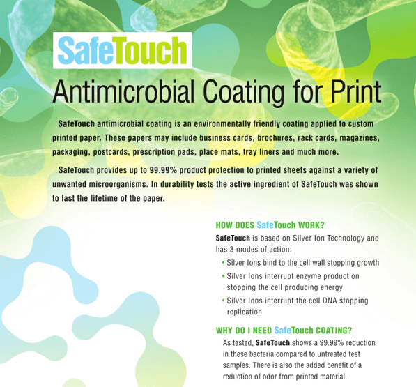 There is a new norm today. There has always been concern with touching things and getting germs, any germs. Especially in public places or items that change many hands. I believe we are all going to be a lot more cautious about what we touch and how we handle things. Our Antimicrobial Coating for Print jobs is the solution for you. Reach out to us next time you need a printed piece and let us help keep safe. info@mmpromos.com