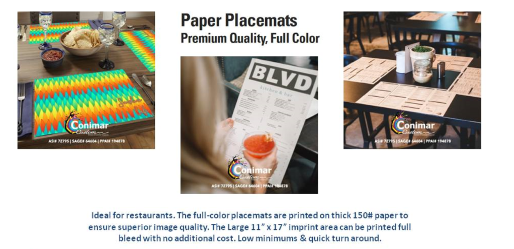 Restaurants are open, mostly outside and with limited seating inside. Everyone wants to know everything is clean and that they will be safe eating out again. Disposable menus and placemats are the only way to go. After each dinner, they are thrown away and never used again. How many can we help you with? Great deals available. We can set you up with a program to save money and time.