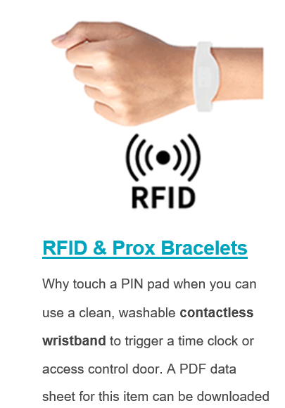 The era of COVID-19 has helped people think differently and be more creative. Our RFID bracelets can be used to trigger a time clock, and stop you from having to use a pin pad. They are also created to help monitor social distancing. Comes with a 2 year warranty, light-weight, washable and hypoallergenic. NO batteries needed. Great for amusement and water parks, assisted living facilities for patient monitoring and gyms for health and fitness tracking. So many uses, so reliable, heat and moisture resistant. Ask us for more information, I believe these will become in high demand as we move forward.