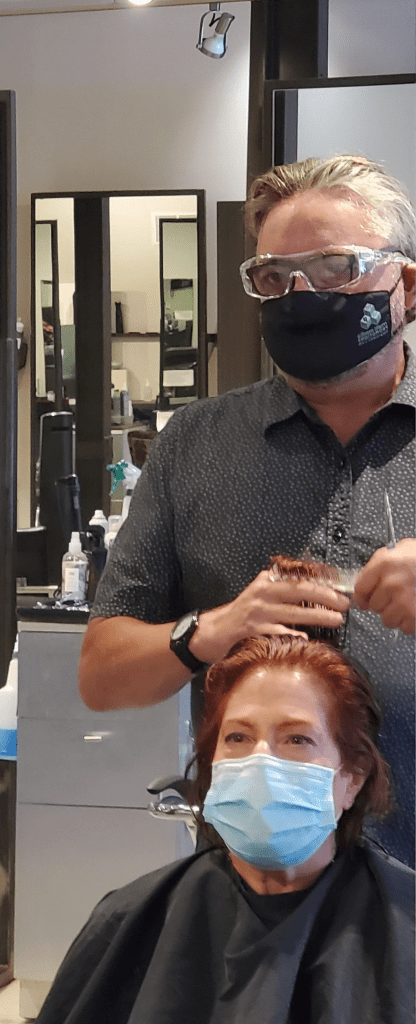 Here you see Simon at ID Salon in Woodbury, cutting my hair wearing our Multi Media Promotions face mask that passes the candle test with flying colors.