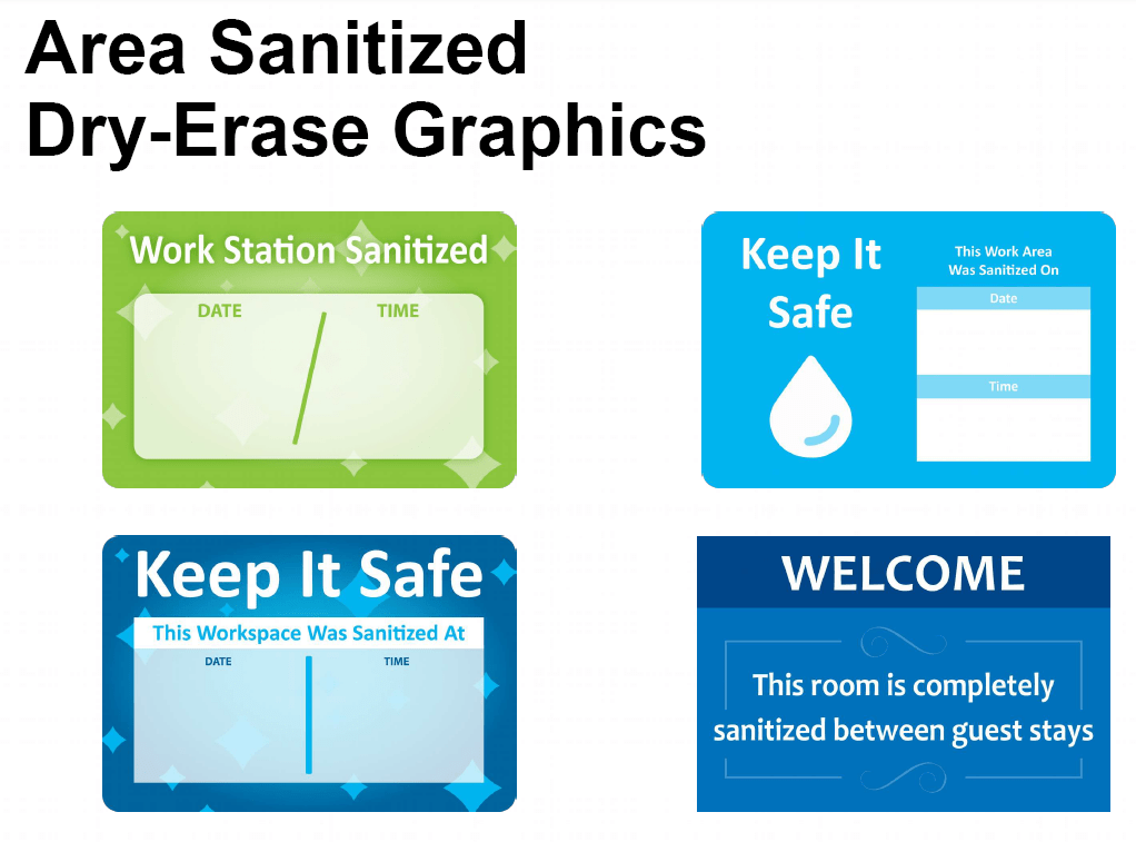 Our dry-erase graphics allows all to fill in the date and time that the area was cleaned. Great for hopsitals, doctor offices and every where you can think.