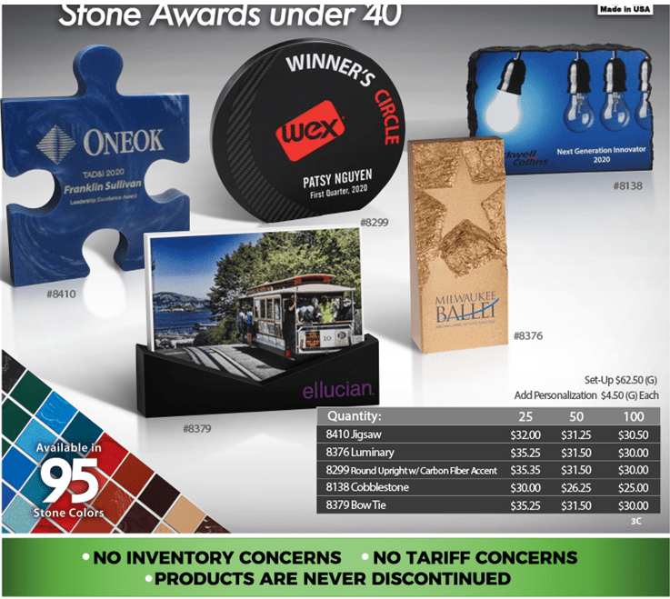 The requests are becoming common, wanted, needed to show our appreciation to employees, caretakers, and those continuing to work to try to keep our lives as normal as possible. For under $40 we will help you choose a custom USA Made stone award in your choice of colors and art that shows how you feel and to let them know that it has not gone unnoticed.