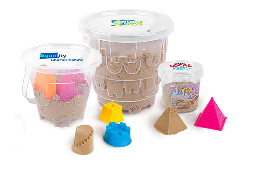 Promote your brand with a fun bucket of sand. Make shapes with the supplied molds or squeeze the sand between your fingets to pass the time of day while stuck at home. Have a fun activity with the kids.