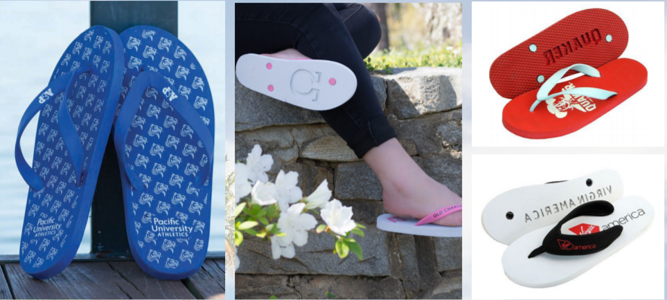 These USA classic Flip Flops come with your choice of 12 vinyl and 5 fabric strap colors with your choice of finishing embroidery, woven patch or fabric straps. 5 Sole colors to choose from.