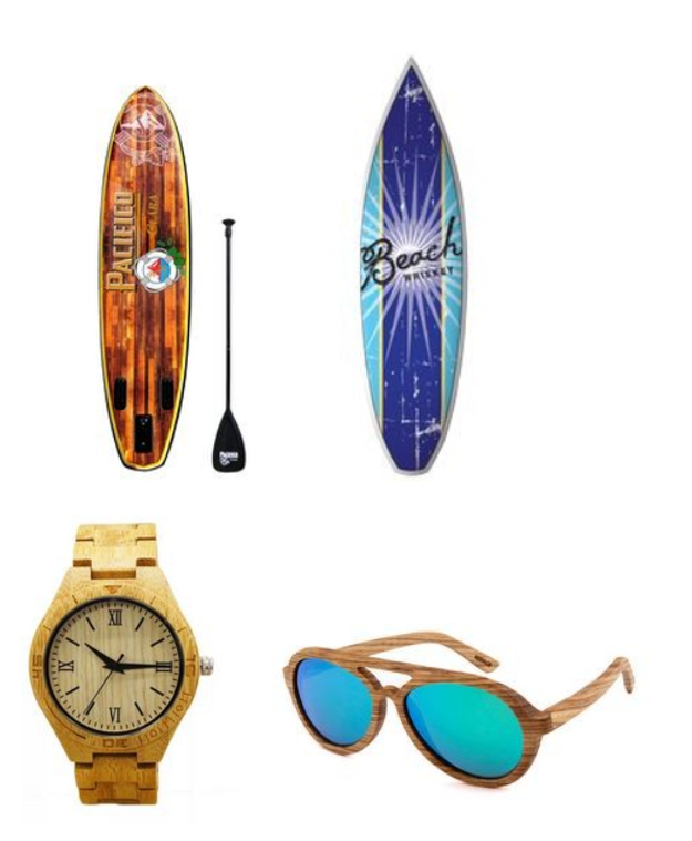 The 6′ USA Fiberglass Surfboard is also for fun in the sun as well as the bamboo watch and sunglasses.