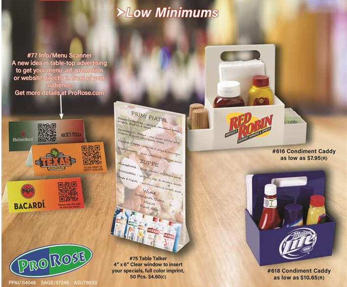 Table tent cards, condiment holders and menu talkers are all inexpensive and can tell your story, advertise your brand, show off your menu and be an easy carryall to use.