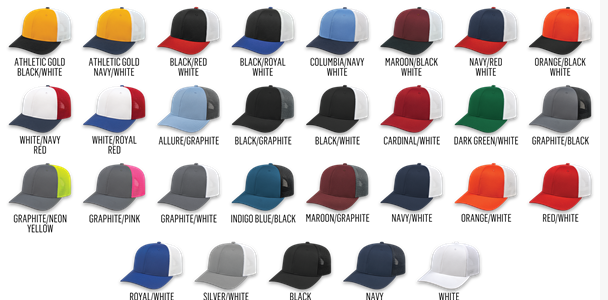 With all these color combinations to choose from, we have you school and company colors on hand. Don’t see your colors, we are happy to create a totally custom cap for you. Don’t’ forget to add your logo, team sport or favorite saying.