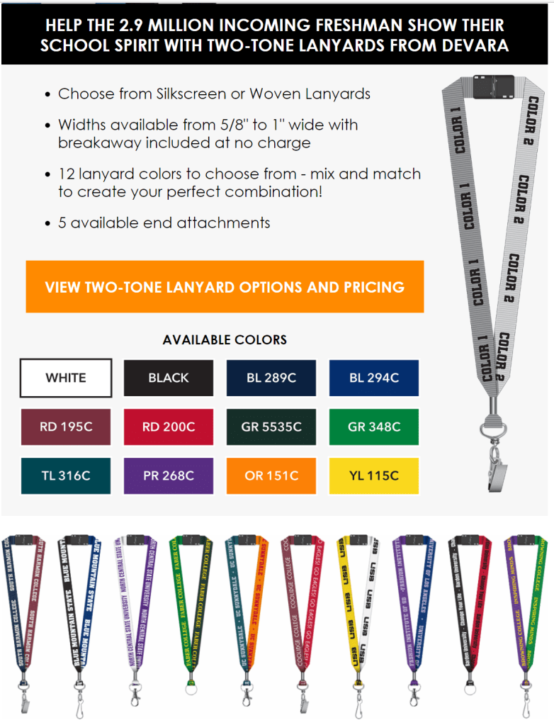 Let us supply your school and brand with lanyards that come with a two-tone version showing your team and school colors.