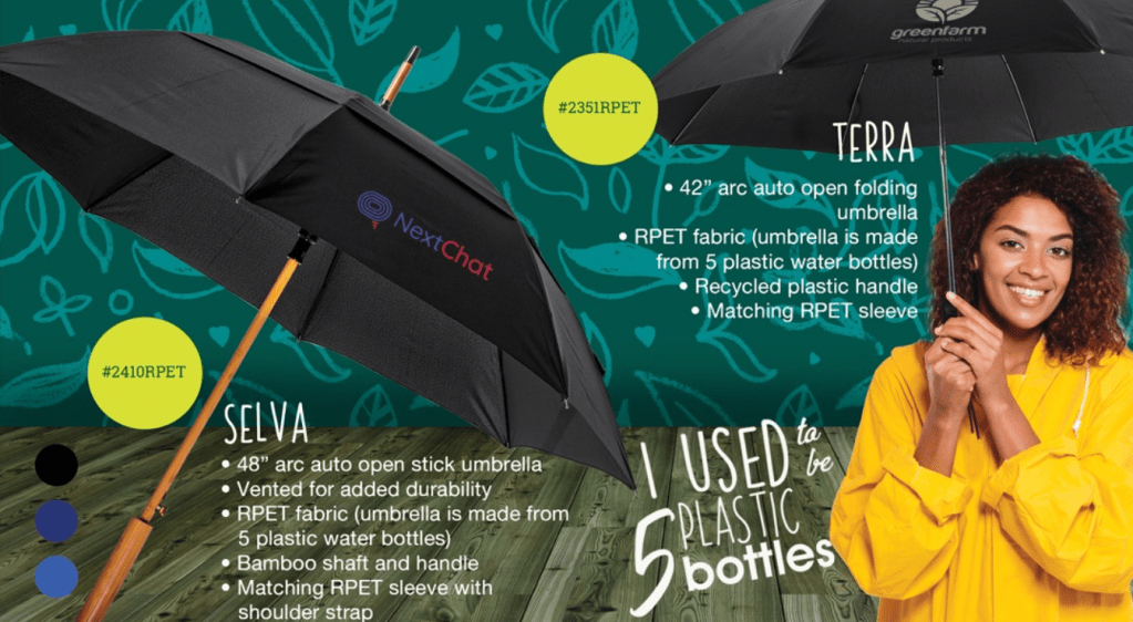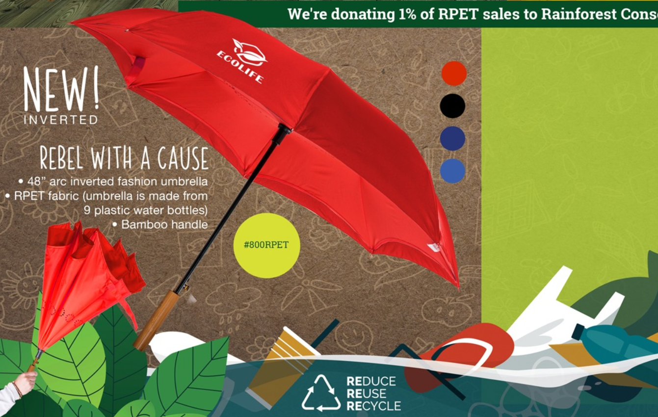 It takes 5 – 9 plastic water bottles to make our RPET umbrellas.
