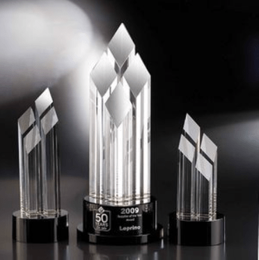 The 10″ Pinnacle Crystal Diamond Award is clear with a black base and is made of optic crystal. The Pinnacle measures 4 1/2″W x 10″H, weighs 7.8 pounds and is presented in a custom gift box.