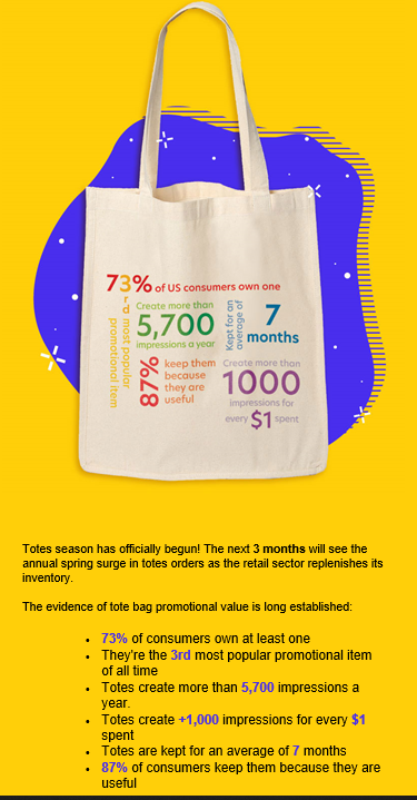 Above are the facts of the giving away tote bags how and why tote bags are so popular and top item to be given away.