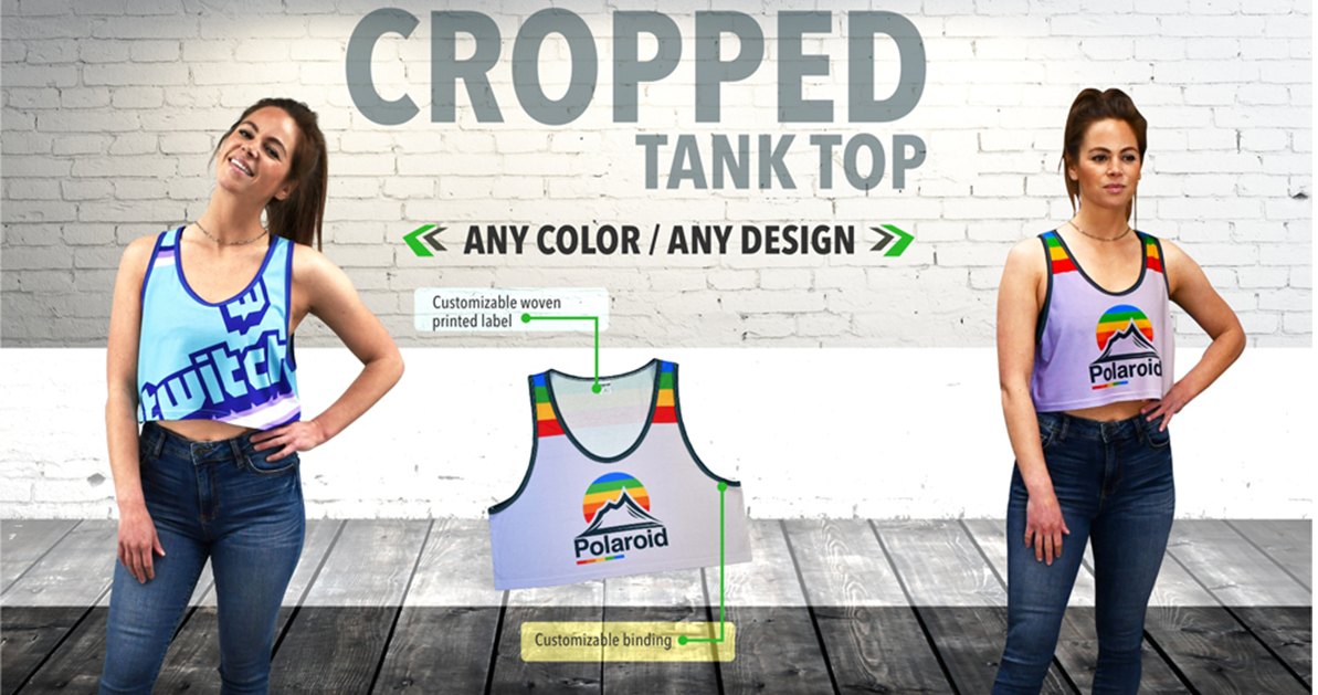 Our custom printed apparel like the cropped tanks above are fashion forward, make a statement and come branded with your logo, sayings and designs.