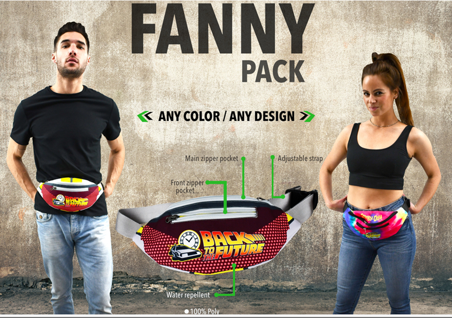 Our totally custom fanny packs come with adjustable straps, main zipper pocket, front zipper pocket and water repellent.