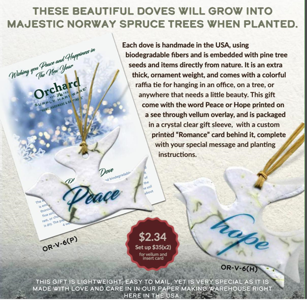 Our hand-made seeded Dove Ornaments when planted will grow Majestic Norway Spruce Trees and are made in the USA using biodegradable fibers and embedded with pine tree seeds.